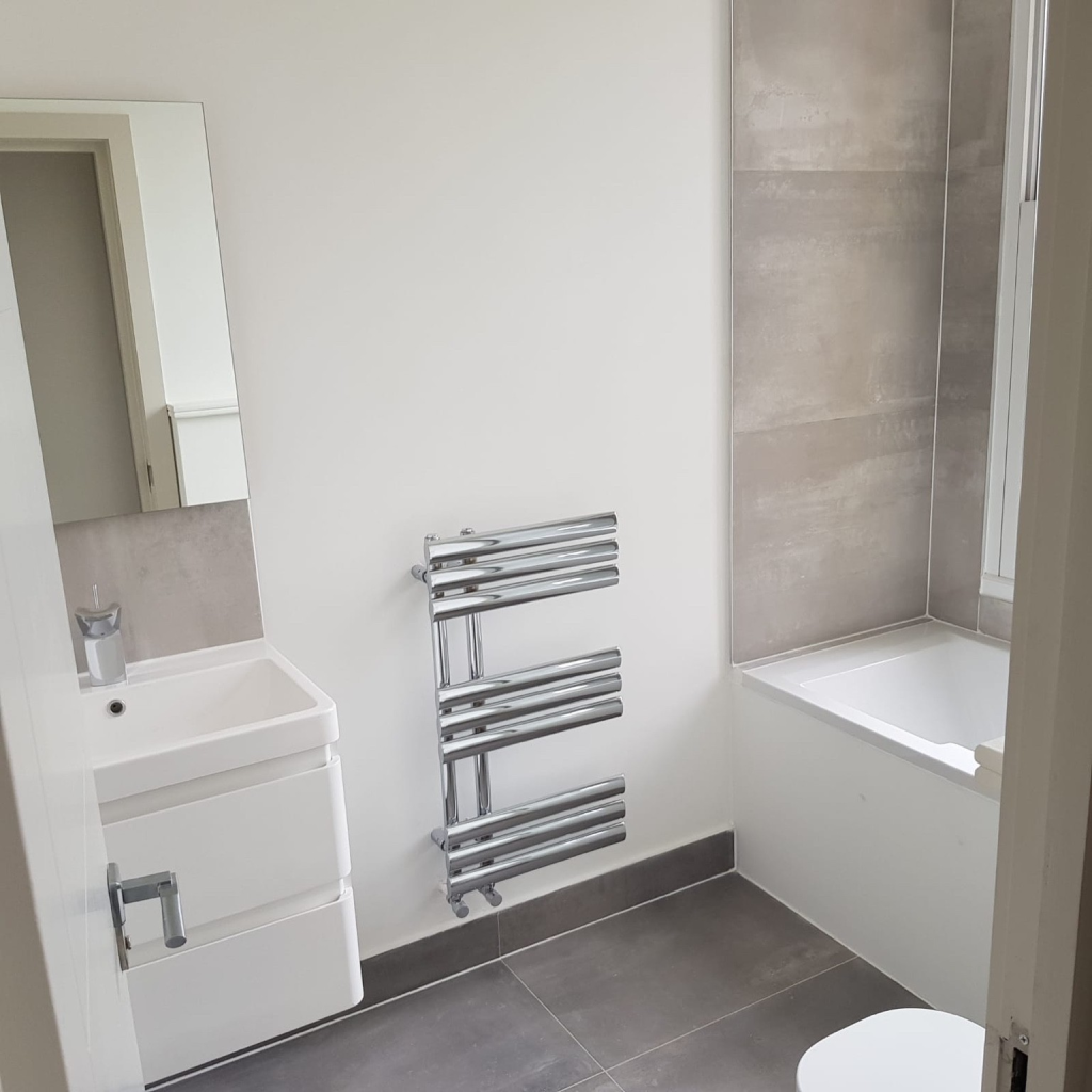 Wall-mounted vanity unit with integrated basin and concealed pipework.