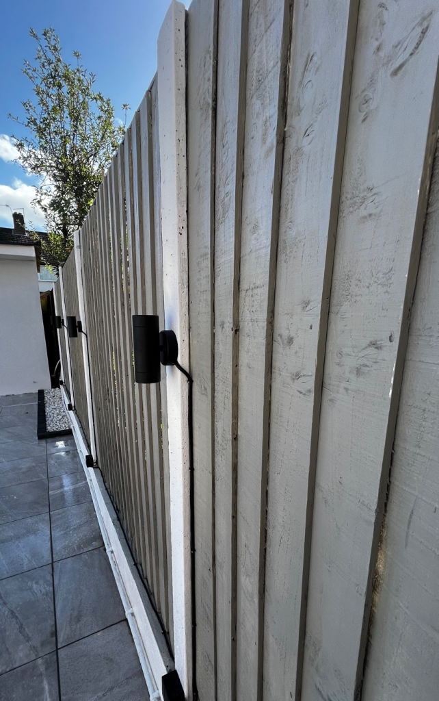 Custom timber fencing with modern up-down outdoor lighting installed.