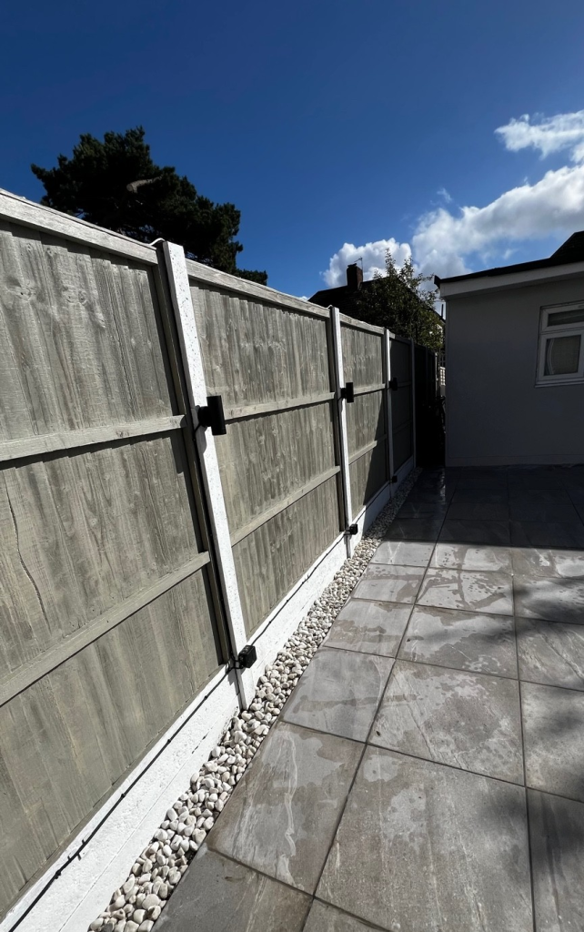 Close-up of stone border and neat edge finishing along the base of the fence.