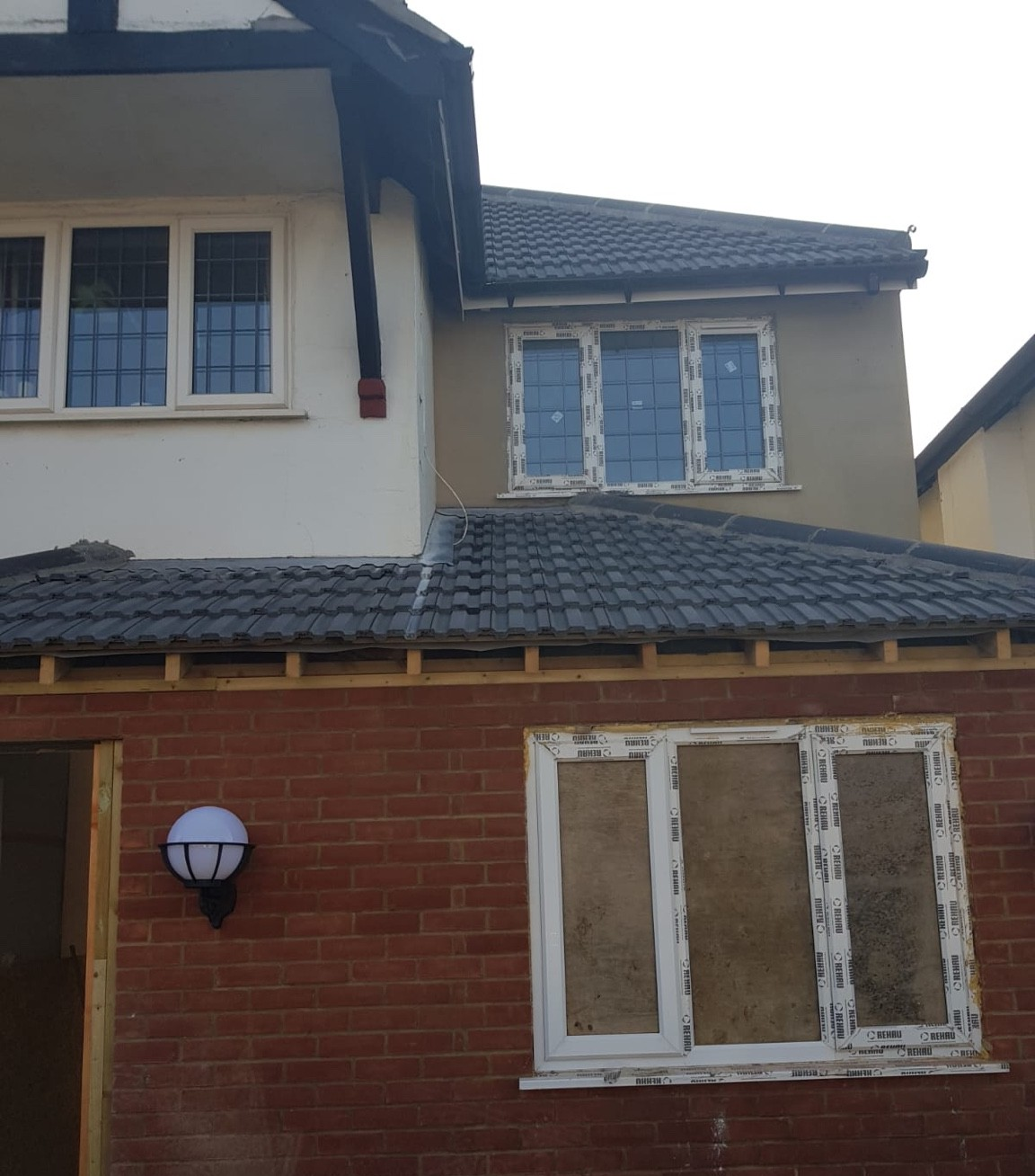 Side and rear extension brickwork completed up to roofline with windows installed.